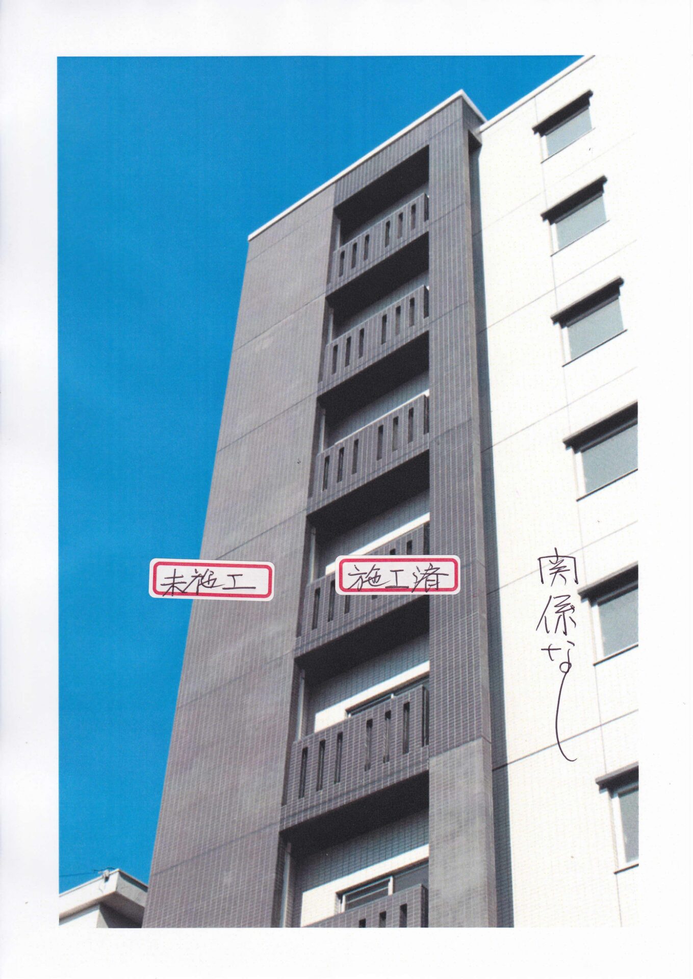 福岡県の9階建のビルです。太陽光の紫外線により経年劣化した外壁が白くチョーキングを起こしています